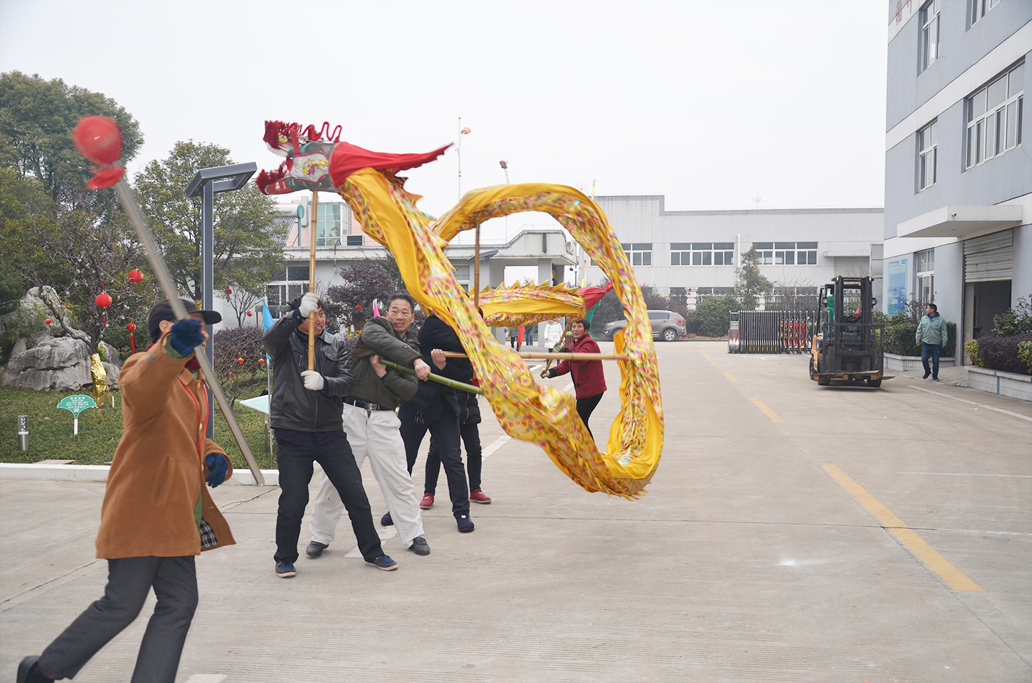 敲锣打鼓的舞龙团队也来到厂前,那威风凛凛的金龙伴随着鼓乐,在龙珠的引导下上下腾飞,不断穿插,向人们展示龙的精、气、神、韵,也寓意着2017年福坤开门大吉。 福坤的年味儿是“新”的