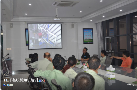 新购德国进口丁基胶机安装调试到位,投入使用。操作、维护保养等业务知识培训同步进行。图为培训会场。