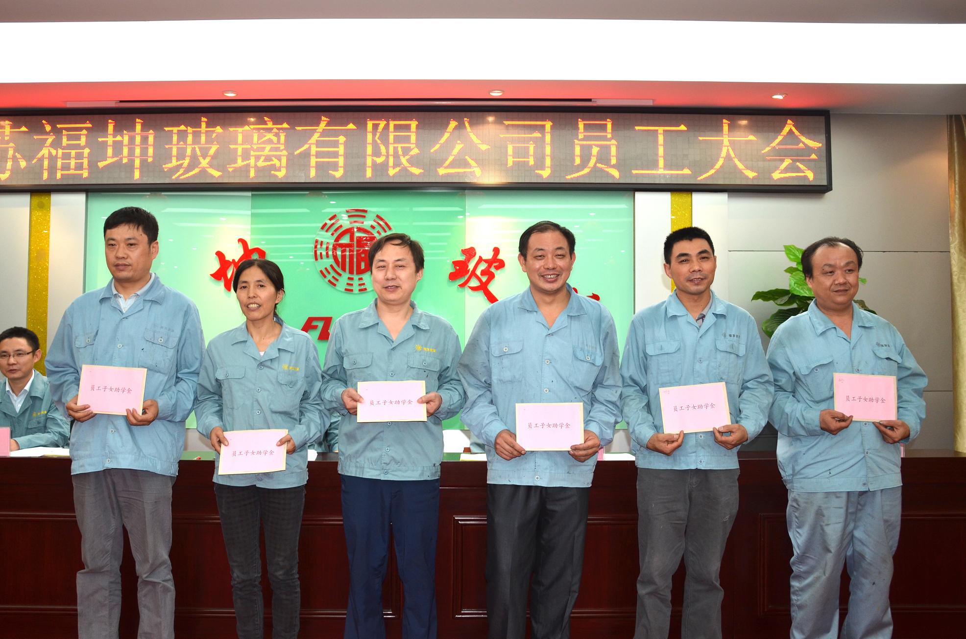 在9月5日的月度职工大会上,洪总亲 自为梅雪生、印永康、邵卫中、陈志荣、刘建、李青霞等6名员工发放首批“员工子女助学金”,并代表公司全体同仁祝贺他们的子女如愿考进理想的高中和大学。 “助学金制度”是公司“关爱员工,打造和谐福坤”的又一项重要举措,制度规定:凡职工子女参加统考统招,升入高中的,公司将给予300元助学金;升入大学的,将给予500元助学金。 公司希望每一位受资助员工继续做好本职工作,做好子女的楷模,并祝愿他们的子女刻苦学习、团结同学、孝敬父母,早日成才!