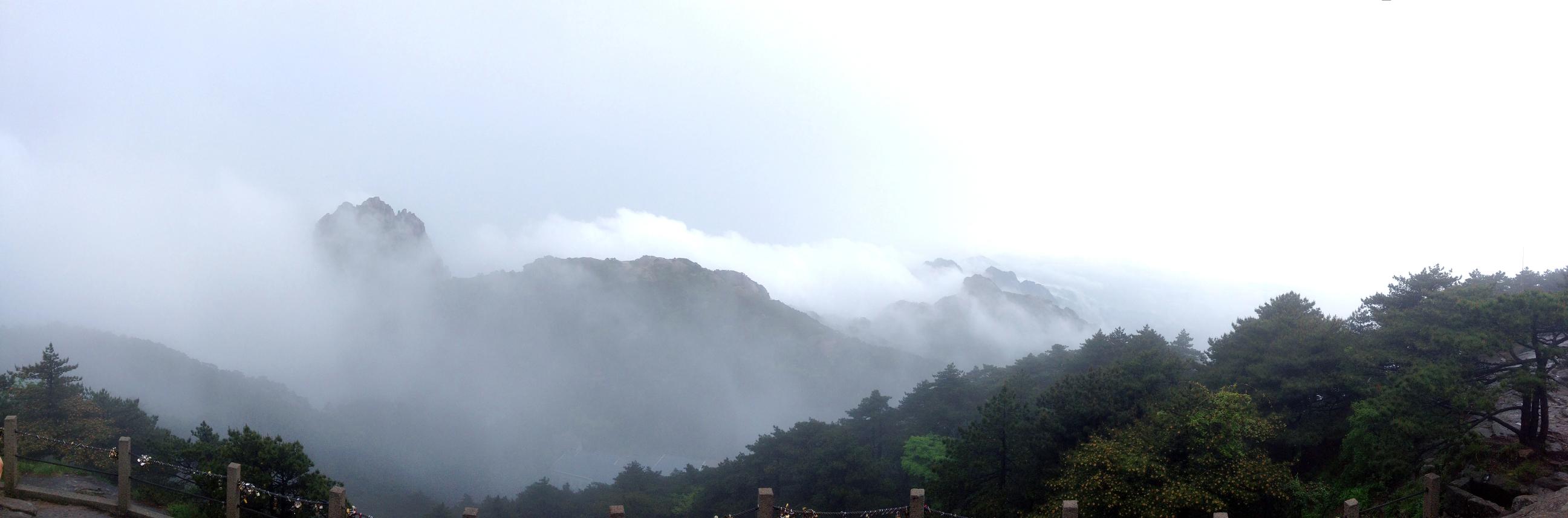 兴许是老天也为我们的无畏和执着所感动,就在我们站在山顶极目远眺的时候,云雾渐渐飘散开,远处的山头宛如半抱琵琶、欲说还羞的佳人隐约显露出曼妙身姿。大家苦尽甘来,终于在黄山之巅品味到了“一览众山小”的壮阔美景。